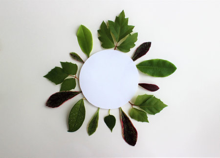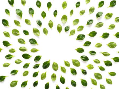 Green leaves are arranged in a circle on a white background.Round frame made from green leaves.Copy of the space.