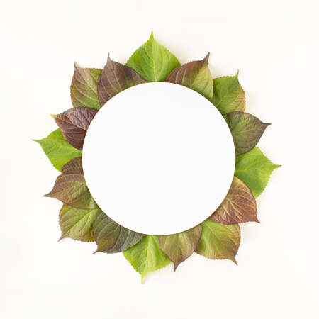 Minimal concept of nature made of green purple hydrangea leaves arranged in a circle. In the middle is a copy paste space