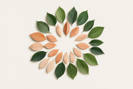 An artistic arrangement of green and beige leaves forming a circular pattern on a light background, perfect for nature themes.