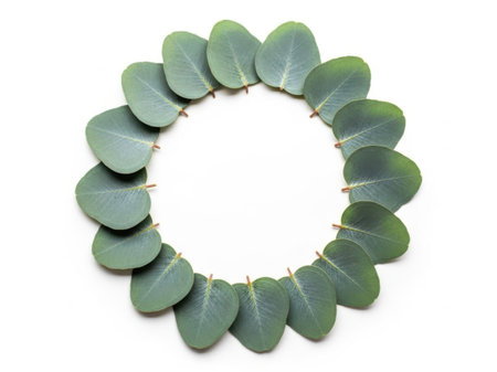 A circular arrangement of fresh eucalyptus leaves set against a clean white background, showcasing their natural beauty and vibrant green color.