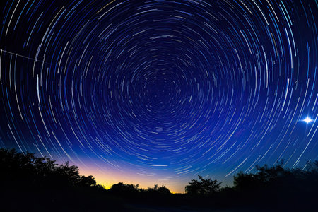 Star trails in a night sky, long exposure style realistic circular star arcs pattern, star motion due to Earth's rotation vector illustration