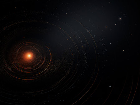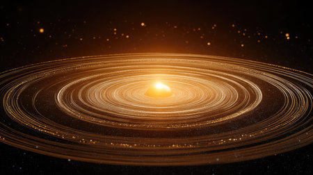 An artistic depiction presents celestial bodies including planets and stars. The illustration features a dark background, contrasting with bright gold and white elements. Circles and lines create an orbital design. This image could be used for various design projects, web content, or print materials.