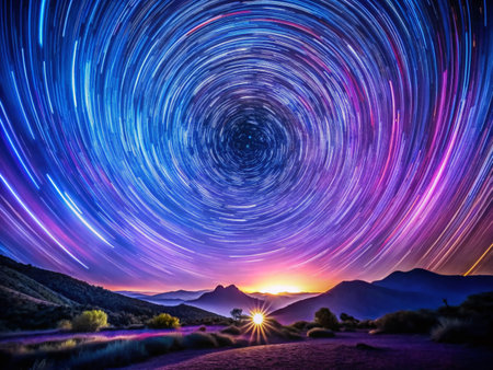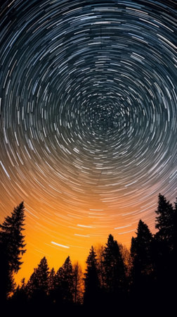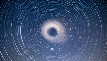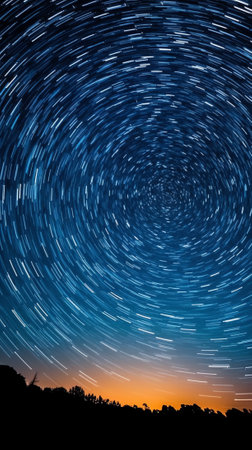 A mesmerizing long-exposure photograph captures the Earths rotation, transforming distant stars into a swirling vortex of light. This celestial time-lapse evokes a sense of cosmic wonder, the vastness of space, and the infinite passage of time.