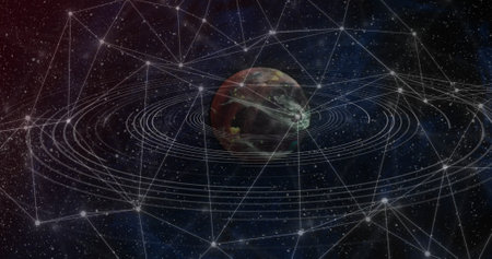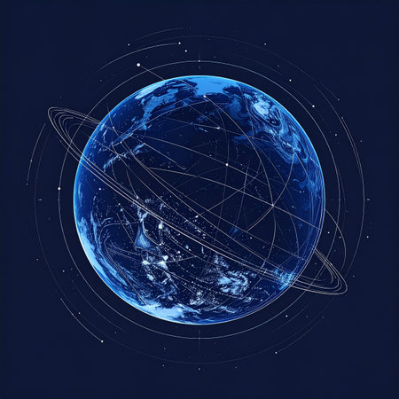 A luminous blue Earth is encircled by intricate orbits of light, representing the constant flow of data and communication that connects continents. This visualization captures the essence of a futuristic global network, symbolizing innovation, progress, and the interconnected digital age.