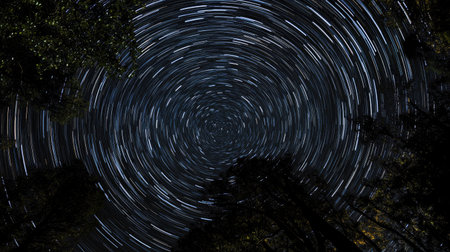 A stunning night sky filled with concentric star trails circling around the North Star, capturing the beauty of celestial motion.