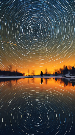 Generative AI : Sky with a trail of stars revolving on the polar star indicating where north is on a lake