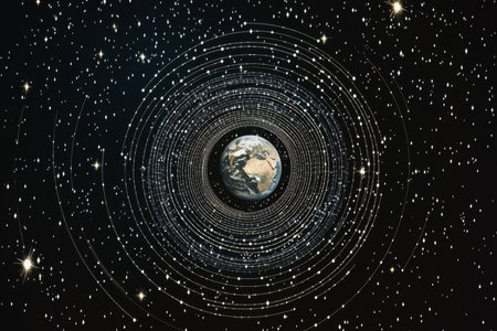 This artwork illustrates the dynamic movement of Earth's orbit in the cosmos, highlighting the intricate trails and bright patterns that represent celestial motion.