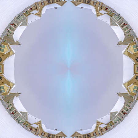 Square frame Circular design made from a winter village with fresh snow cover