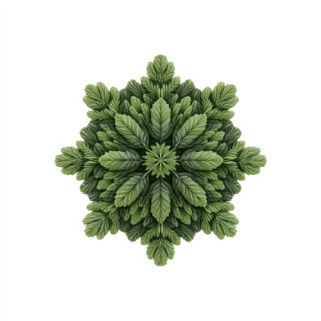 This stunning arrangement of lush green leaves forms a symmetrical mandala design on a pure white background, ideal for nature, art, and decoration themes.
