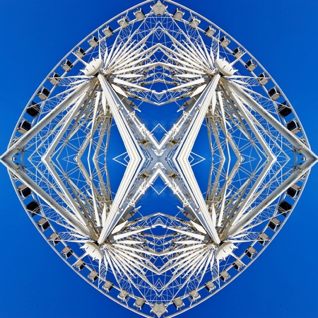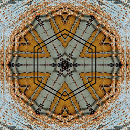 Interesting Circular green metal bars created using reflections in a rounded shape from a bridge in California. Geometric kaleidoscope pattern on mirrored axis of symmetry reflection. Colorful shapes as a wallpaper for advertising background or backdrop.