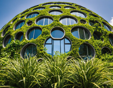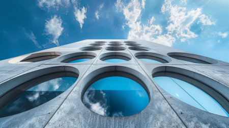 Modern building facade with circular windows against a blue sky.