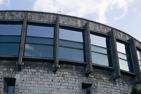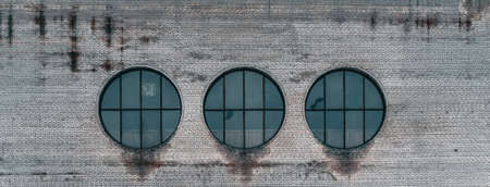 Soviet Brutalist Architecture in St. Petersburg. Three round windows on a brick wall