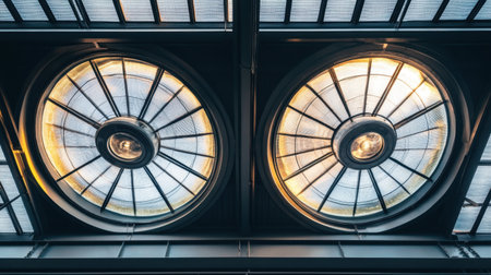 Captivating image showcasing an intricate architectural ceiling with large round skylights, blending modern glass elements and ambient light for an artistic feel.
