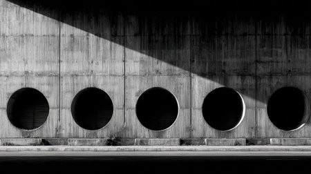 A striking monochrome image showcasing a concrete wall adorned with circular openings, accented by strong contrasting shadows and light, creating a modern industrial aesthetic.