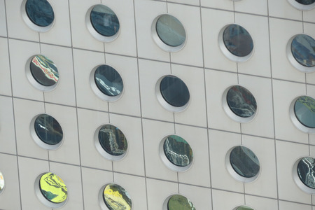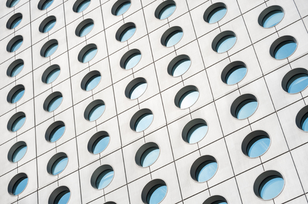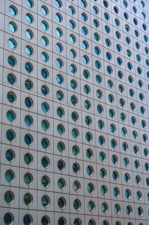 A detail image of the exterior wall of a modern building covered with round windows