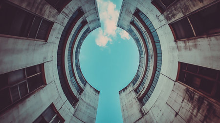 Upward perspective of a weathered, circular concrete building with multiple floors of windows, creating a symmetrical frame with a vertical opening.