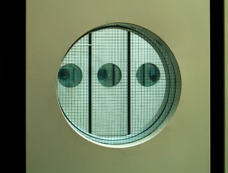 A big rounf window on a modern gray building