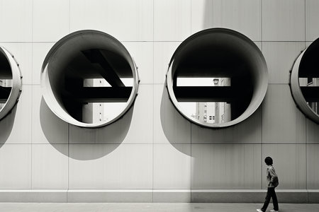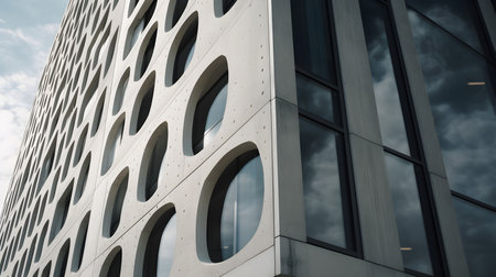 An architectural image showcases a concrete facade featuring a pattern of circular forms with golden accents. The composition employs a low-angle perspective, emphasizing the linear arrangement of elements. Ambient lighting casts shadows, highlighting textures. Suitable for illustrating modern design, urban environments, or creative projects.