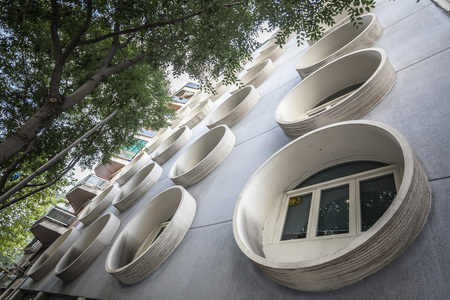 BARCELONA,SPAIN-AUGUST 6,2015: Modern architecture, apartment building, Valencia street, detail facade big round windows, by architect Mario Catalan Nebot.