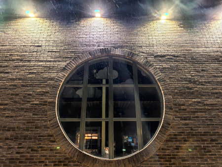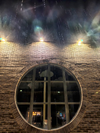 Raindrops cascade off a round window of a brick structure at night, reflecting the warm lights and urban ambiance outside.
