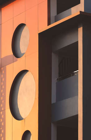 Golden sunlight and shadow on surface of geometric pattern of modern building wall at sunset time in vertical frame, abstract architecture background