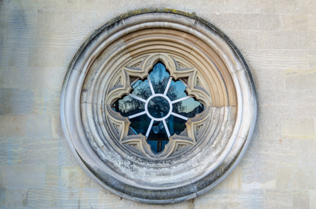 Vintage circle wooden window on a brick wall building. Architectural design with lines and circle
