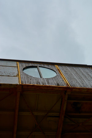 Round window in metallic rusty ship wall