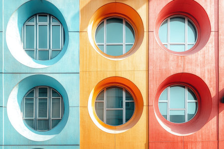Modern architecture showcasing round windows embedded in a vibrant, pastel colored facade