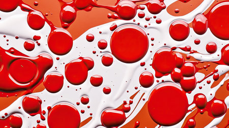 Abstract white paint drops mixed in red oil background. Non-mixing fluids pattern. Generative AI.