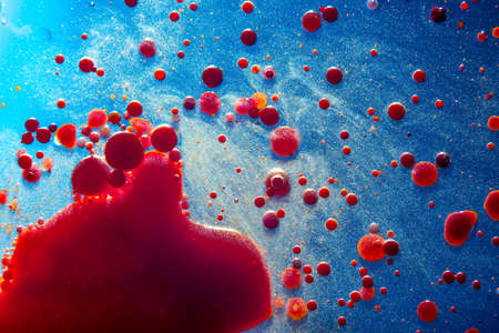 Oil art. Paint mix. Defocused red pink crimson color ink water bubbles drops blob spherical texture spreading on abstract background.