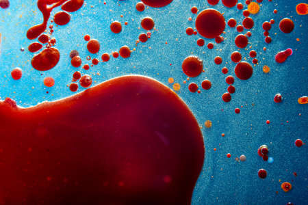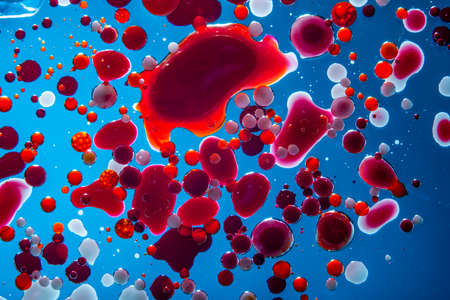 Red bubbles of blood cells on a blue background closeup. Abstraction of medicine and science. The concept of micro processes and diseases in the human body