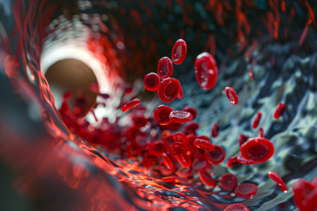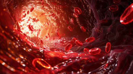 This image presents a detailed visualization of the interior of a blood vessel, showcasing flowing red blood cells and a glowing plasma environment, perfect for medical illustrations.