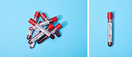 collage of test tubes with blood samples and coronavirus test lettering on blue