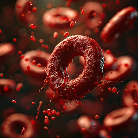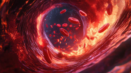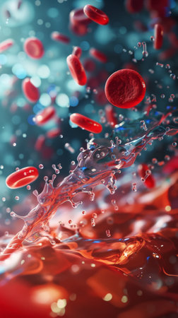 Dynamic depiction of blood cells within fluid, illustrating the profound impact of sugar on the human body at a microscopic level