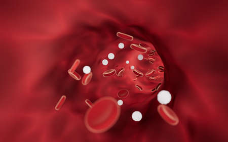 Red and white blood cells in blood vessels, 3d rendering. Computer digital drawing.
