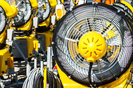 Close-up of big industrial fan in a factory. Ventilation of plant building. Backlit, sun light, rays of light.