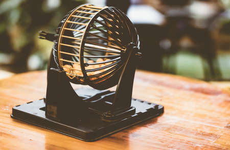 Young man hands hold lotto sphere for small balls spin, table loto game. Concept symbol of future choice, life problem crisis , invention idea, times to come, futurity, alternative way