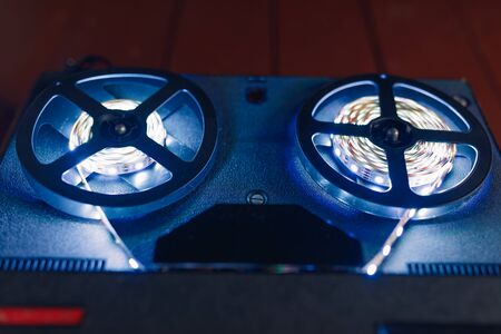 Many colorful pc coolers, cooling fans with neon LED light on table at computer exhibition, trade show - close up view. Technology, gaming, equipment, electronic concept