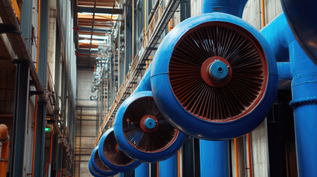 This detailed image captures industrial blue turbines in a modern facility, highlighting advanced engineering and technological design within the manufacturing environment.
