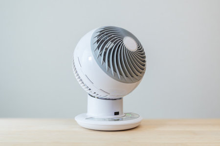 A small fan gently spins on a tabletop, casting a delicate breeze across the surface