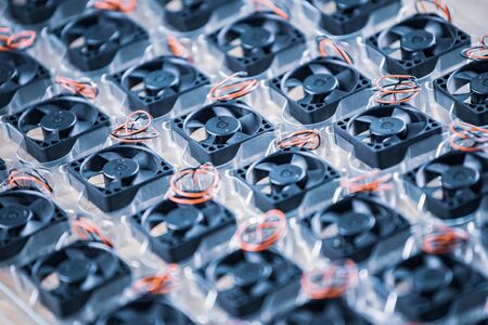 Close-up small plastic computer coolers with wires lie in transparent plastic package on a wooden table in the manufacture of computers. Computer and equipment factory concept
