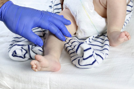A specialist pediatrician conducts a screening examination of the babys body. Copy space - the concept of childrens health and disease prevention, pediatrics, growth
