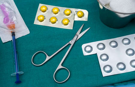 Scissors surgical with torundas in an operating theater, composition horizontal, conceptual image