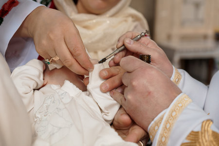 Intimate moment of religious sacrament, an Eastern Orthodox priest performing the anointing of a babys foot with holy oil during a baptism ceremony, focusing on faith