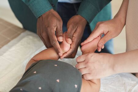 Close up of interracial parents massaging feet of cute baby lying on changing table while dressing him, copy space