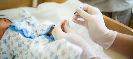 doctor takes a blood test in newborns. Extract from the hospital