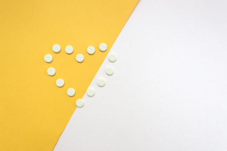 pink pills laid out in shape of a heart on brown background. coloured drugs. concept - heart disease, heart disorders and drugs, cardiology, valentines, love