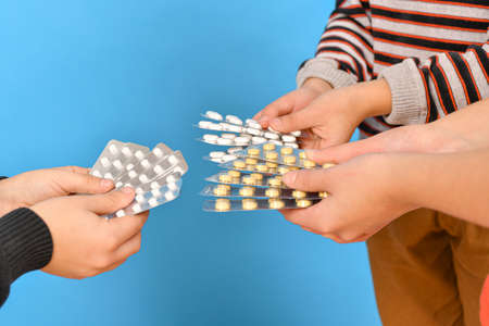 Child hands holding a lot of different pills and capsule. Healthy, medical concept.