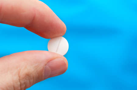 White tablets on a blue background are isolated. Layout of Flatley tablets. Gloved hand with a pill. Virus protection and 2019-ncov.