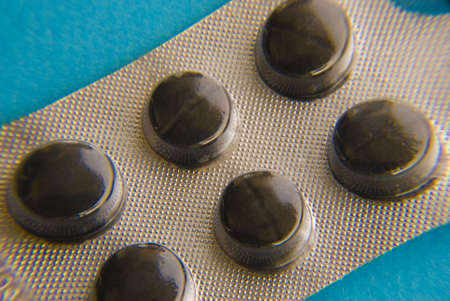Two pills packages on black background/Packages of pills are placed on a black background. Top view and copyspace